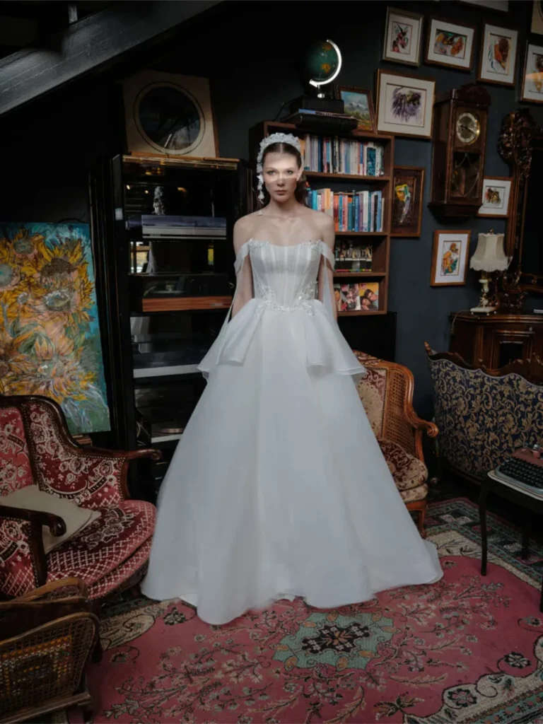 Üç boyutlu çiçek detayları, geniş kol kesimleri ve sade kuyruk seçenekleri ile tarihi mekan düğünlerinden kır konseptine kadar pek çok organizasyona rahatlıkla uyum sağlar.